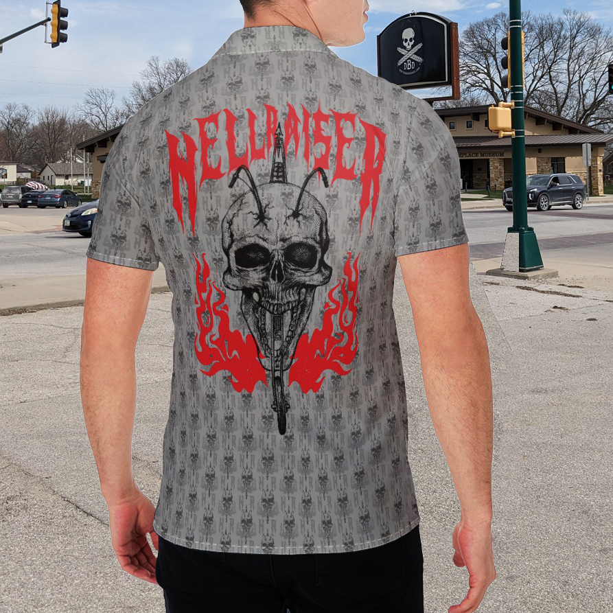 This breathable button down shirt features a sketched skull graphic with a chopper breaking through on the back, topped with the word "Hellraiser" in flamed text, and flames below. On the collar the same flames as tips, and the skull/chopper graphic along with the letters "HR" create a pattern across the entire shirt.