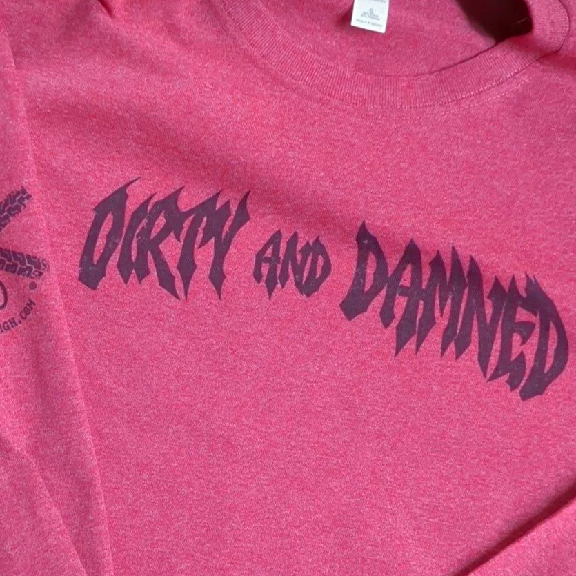 Get ready to haunt the highways in style with our exclusive Halloween long-sleeved shirt! This heather red design is a killer addition to your spooky season gear. The back features an eerie scene: a rebellious skeleton rider tearing down the road, tailed by a devil with arms reaching forward in relentless pursuit. Up front, “Dirty & Damned” claims your fearless spirit, while a modified company logo on the sleeve marks this as a true original. Whether you’re taking to the road or the night, this shirt’s haunting details make it the perfect gear for thrill-seekers and rebel souls alike.