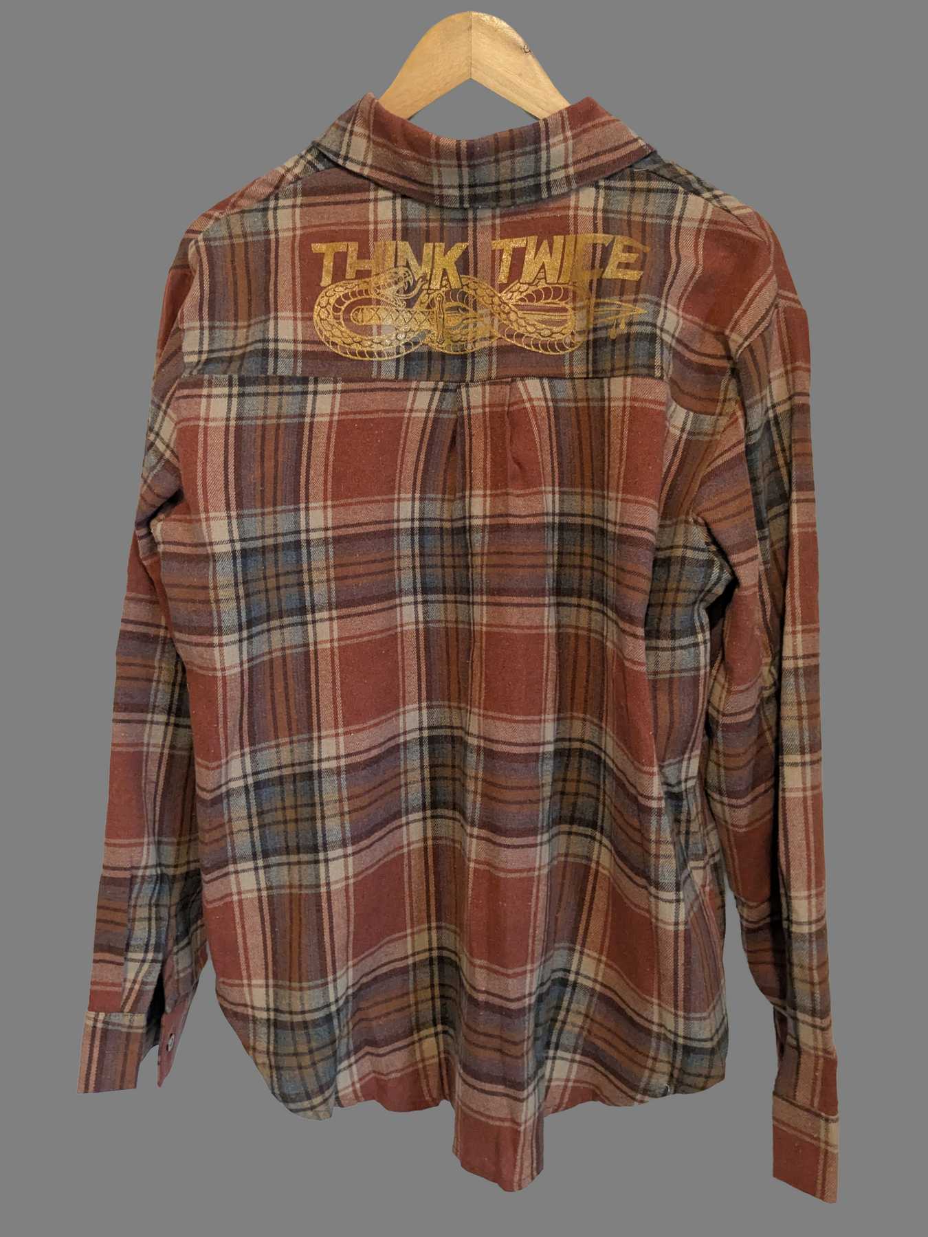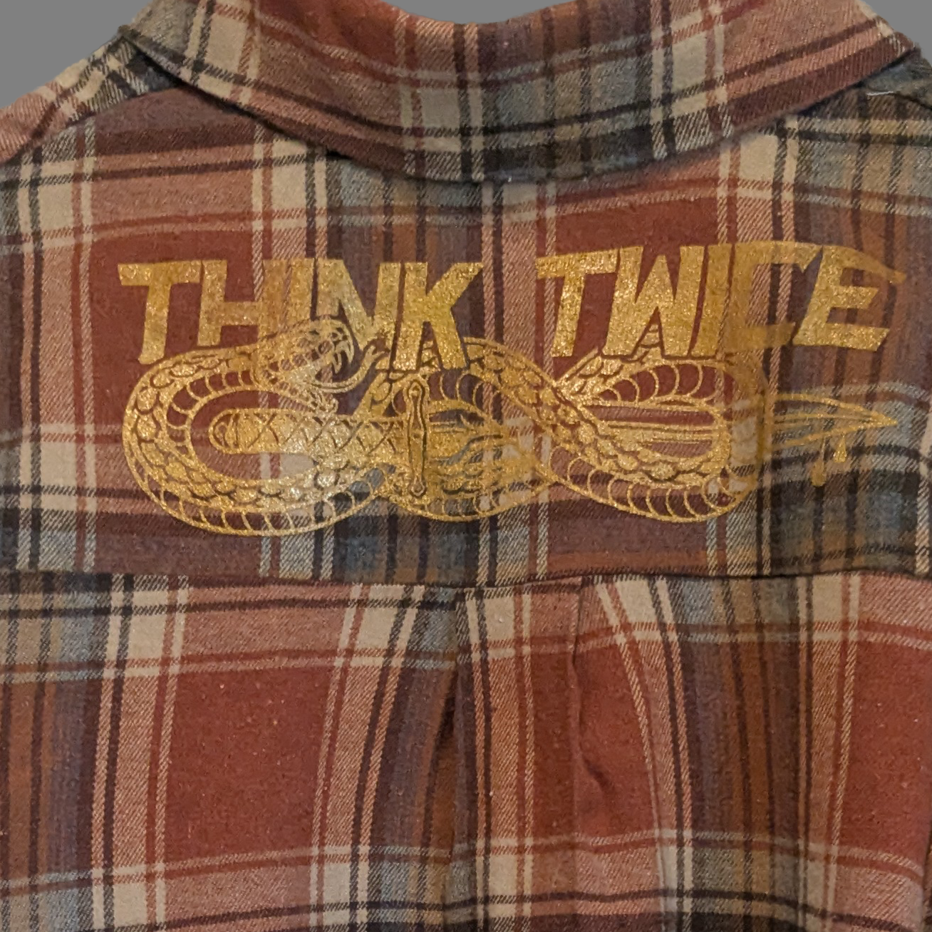 The Think Twice Women’s Flannel brings attitude and edge with a bold gold metallic back print featuring a coiled snake around a dagger and the message “Think Twice.” It’s a statement piece that carries the same energy as the riders who wear it — confident, unapologetic, and not to be underestimated.